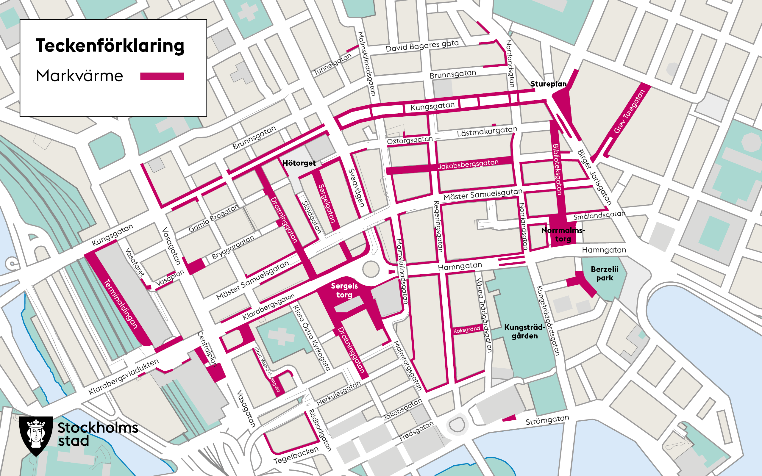 Flera av stadens trottoarer och gångbanor värms upp underifrån. Markvärme läggs främst på centrala platser där det rör sig mycket människor, och i samband med andra större grävarbeten. Ofta finansieras markvärmen i samarbete mellan Stockholms stad och fastighetsägare.